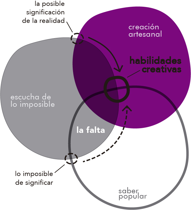 HACER EL MUNDO. La carencia material, más allá de una situación de desigualdad económica que aumenta necesidades básicas insatisfechas, afecta directamente en la constitución de la subjetividad, pues la consistencia material del mundo (el cuerpo, el territorio, los objetos, los otros) va a incidir en las posibilidades de significación de la realidad, o dicho de otra manera, hay una relación entre las palabras y las cosas. La adquisición de lenguajes artísticos que permiten la transformación creativa del mundo, indistintamente del medio (una hoja de papel, un muro, el cuerpo, etc), es una manera de producir significaciones alternativas de la realidad, en el tanto se modifica significado e imagen significante al tiempo. De esta forma, las habiliades creativas podrían prevenir que la suplencia a la carencia se realice por medio de la criminalidad o por otras actividades de producción económica por fuera de la legalidad y el contrato social.